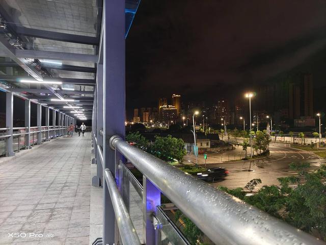 同样的我们来看一下vivo X50 Pro的实拍样张。下面这张图片的拍摄时间正好是夜间,此时附近只有人造光源,可以算是光线较少的拍摄环境。但是在这种情况下vivo X50 Pro依然拍出了整体观感非常优秀的照片。近处栏杆上的水珠被记录了下来,远处推着自行车的行人也被记录了下来,甚至更远处隐隐开着灯的楼房都被记录了下来,可见夜拍实力非常强悍。夜间想要将色彩还原到真实情况比较困难,但是从这张照片上来看,树木的绿色和马路的灰色都得到了还原,色彩表现同样优秀。