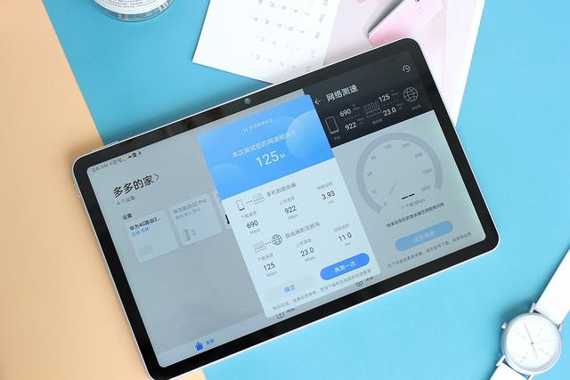 对WiFi 6的支持,荣耀平板V6可以通过荣耀路由3得到更快更稳定的网络连接,实测移动200M宽带,平板电脑到路由器的下载速度达到了690Mbps,上传接近了千兆,网络延时只有3.93ms;外网下载为125Mbps,上传23Mbps,也达到了运营商提供的带宽上限。重要的是平板电脑距离路由器10米外,隔着墙也能满格连接WiFi 6,这在WiFi 5G的手机上是无法实现的,从此再也不用纠结WiFi 2.4G的抗干扰能力和WiFi 5G的信号覆盖。