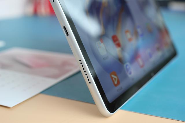 中框也许是展现外观设计构思最多的部分了,接口开孔和边缘倒角都是风格打造的重要构成,以至于用户看到平板电脑的中框就会认出这是荣耀品牌。荣耀平板V6的中框比较圆润,带有轻磨砂的触感,握持舒适。通过接口开孔会发现这款平板有四组扬声器开孔,对应了4声道的说法,多声道的妙处在于利用Histen6.1 3D立体音效技术,让处在皇帝位的用户听到具有三维空间效果的声音,打游戏时对喜欢听音定位的玩家更有爽感。
