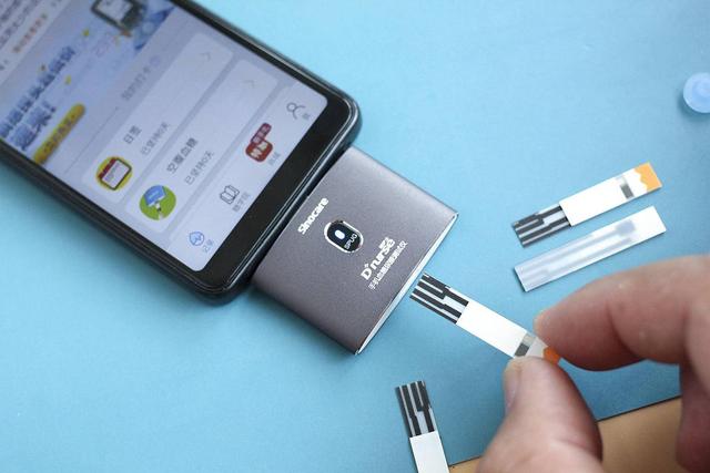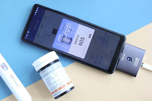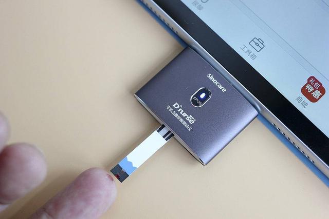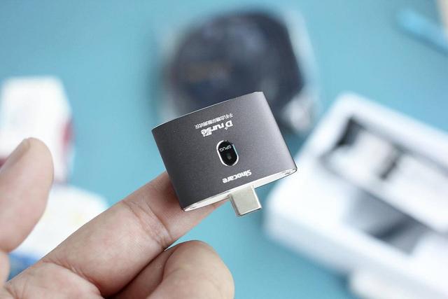 糖护士SPUG血糖尿酸测试仪的机身很小,7075航空铝外壳,外观与我们平时使用的SD卡读卡器有些类似,使用也很简单,一端通过Type-C接口与手机相连,另一端插入试纸,打开手机糖护士APP便可以取血检测,使用非常方便。