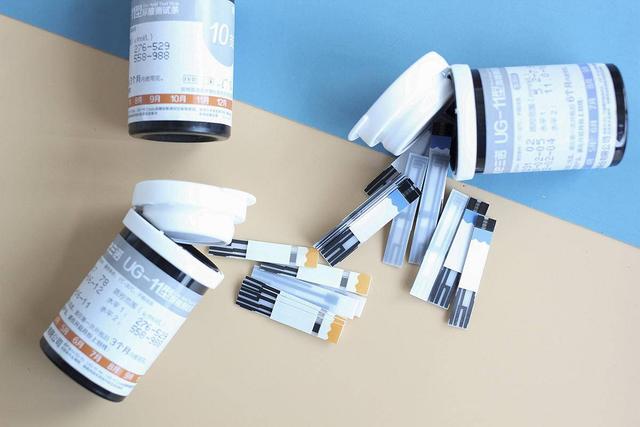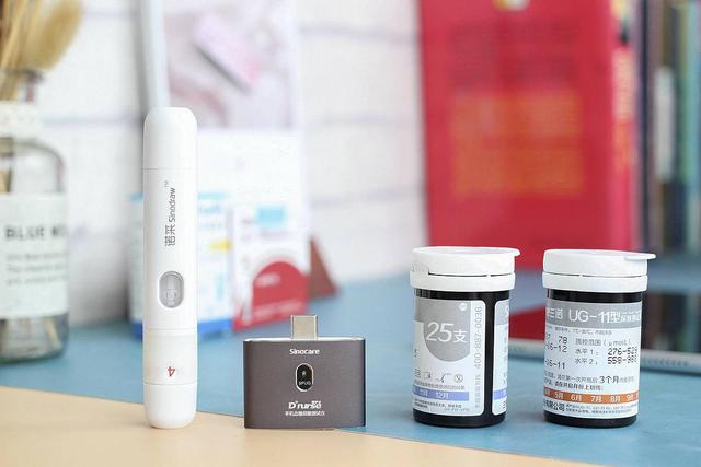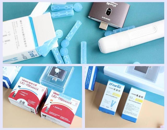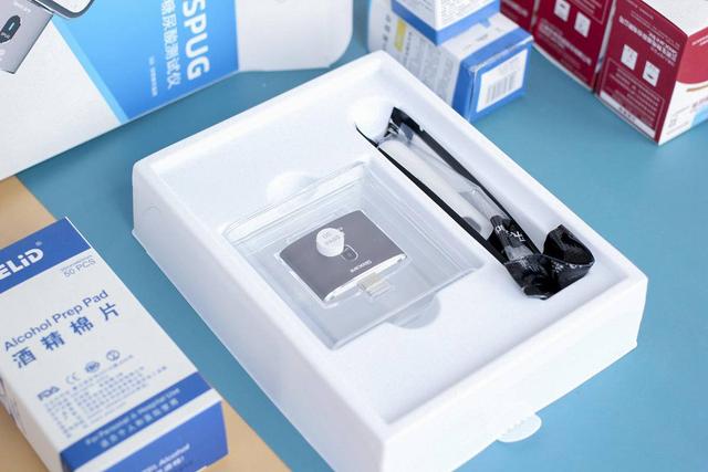 套装产品附赠了收纳包、采血笔、采血针,血糖试纸、尿酸试纸,以及一些酒精棉片。