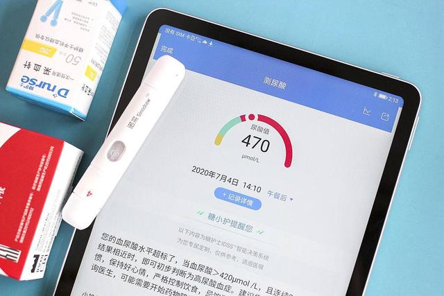 检测血糖的时间只需5秒,趁着指尖血珠还未凝固,可以再插入尿酸试纸继续测试。尿酸检测时间稍长,需要25秒。检测结果与前些天的体检结果一样,仍是470umol/L,根据屏幕提示,该数值已经超标,并且给出了控制尿酸水平的相关建议。仅此点就要比自带屏幕的产品更具实用性,如同医院就医,患者的检测结果是给医生看的,而患者是听医生的专业建议去的,单纯的数据还是结合医嘱才更有价值。