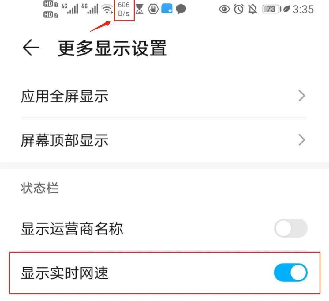 打开手机【设置】,点击【显示和亮度】-【更多显示设置】,就会出现下面的页面,然后把【显示实时网速】打开即可。