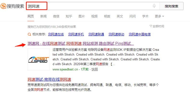 随便找一个浏览器,在搜索页面输入关键词【测网速】,然后在搜索页面,直接点击排名第一的搜索结果即可。