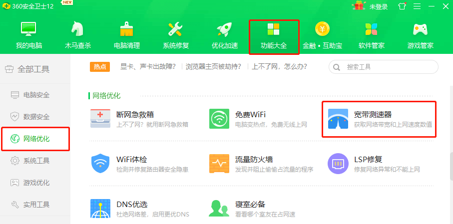 在电脑中找到360安全卫士,双击打开后,找到【功能大全】, 然后点击【网络优化】,在右边页面找到【宽带测速器】,点击等待几秒后,就会显示出测试结果。