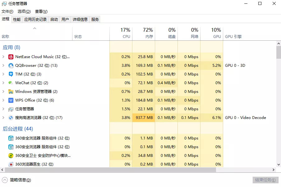 在电脑桌面点击右键找到【任务栏】或直接按快捷键【Ctrl+Alt+Delete】,选择【任务管理器】,就会出现如下图所示页面。能够显示出电脑正在运行软件的内存、网络等数据。