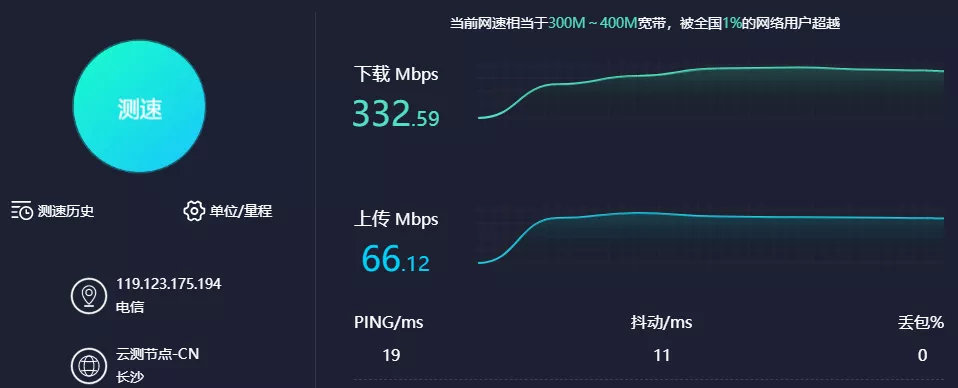 点击进入后,在页面中间有一个非常大的“测速”按钮,直接点击就可开始测速。等待几秒后,下载和上传的曲线及网速数据就全都显示出来了。