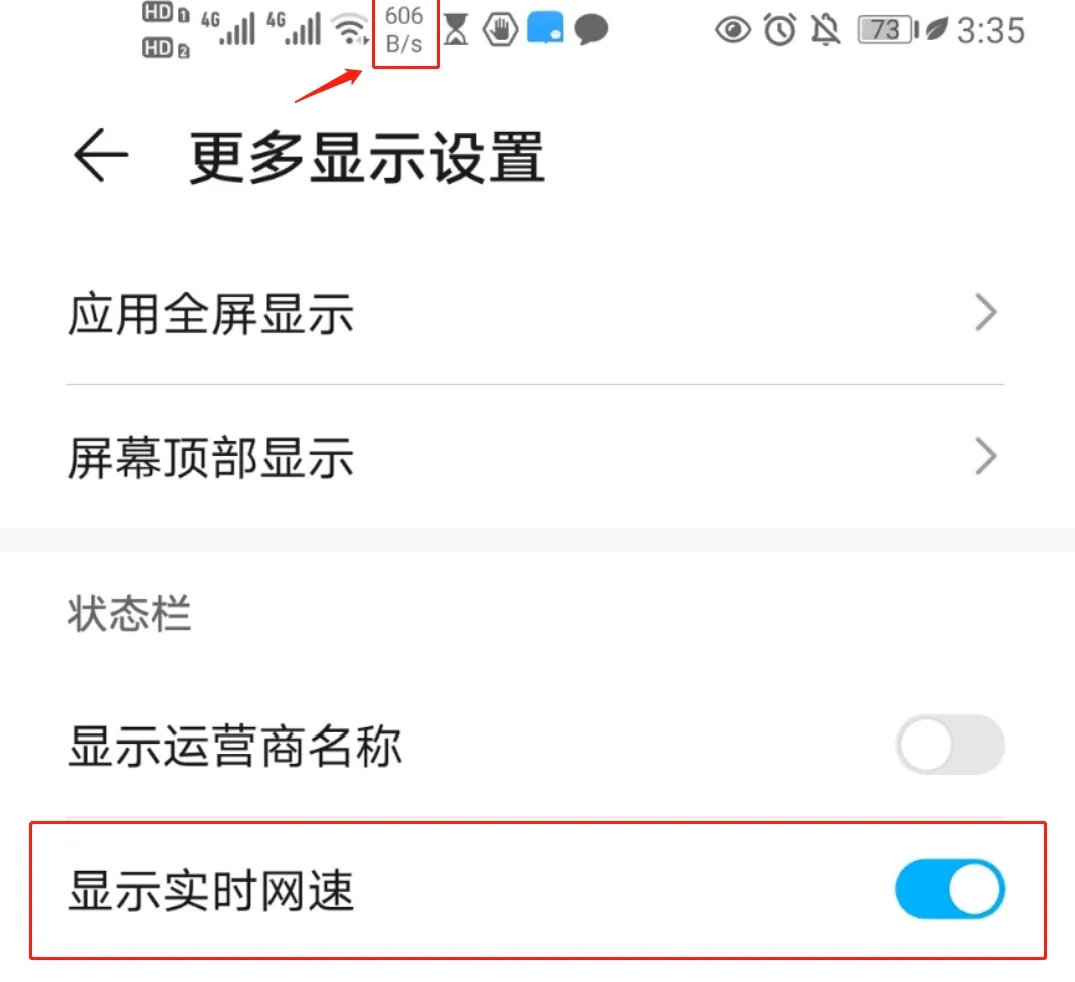 打开后,在手机的最上方就会显示实时的网速情况,如下图所示: