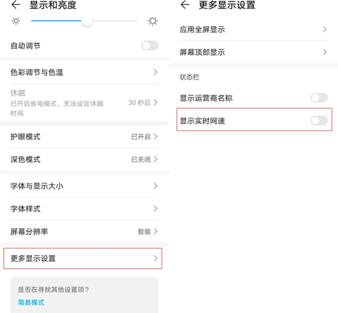 打开手机【设置】,点击【显示和亮度】-【更多显示设置】,就会出现下面的页面,然后把【显示实时网速】打开即可。