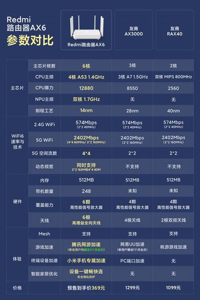 小米Redmi AX6就是这样一款路由器,预售到手价仅369元,但是我们可以对比一下Redmi AX6和1299元的友商AX3000和1099元的友商RAX40对比,无论是主芯片配置,还是WiFi6速度与技术、硬件、体验等,Redmi AX6都是越级全面碾压千元路由器的,雷军在近日的公开信上提到“性价比为纲”,这款小米路由器真是发挥的淋漓尽致,完美的诠释了这一“铁律”。