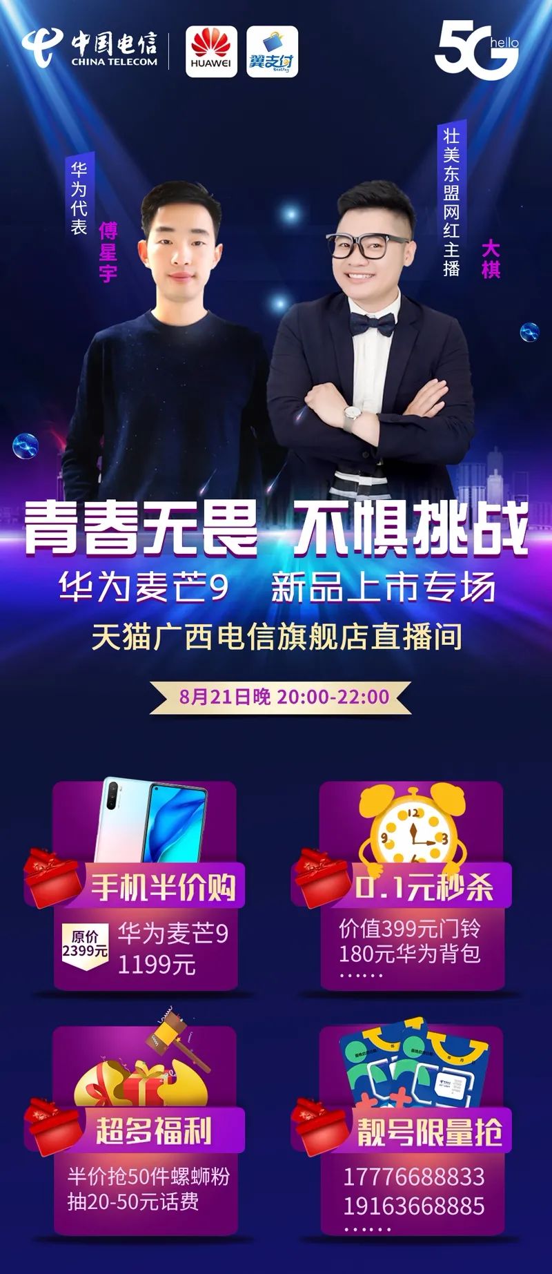 华为麦芒9是华为与中国电信联手推出的一款5G手机,目前售价2399元,相对而言还是比较便宜的。在这里小编给大家介绍一种半价购买的方式,8月21日晚20:00,广西电信将携手华为在广西电信天猫旗舰店进行华为麦芒9直播推荐会,届时参与直播的观众将有机会半价(1199元)购买华为麦芒9,同时直播间还有其它好礼限时秒杀。
