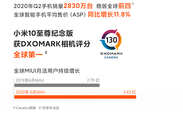 小米刚刚公布的2020年第二季度财报也显示,小米的中高端手机销量比进一步攀升,手机的平均售价(ASP)同比上涨了11%,而且这个数据也已经连续两年出现上涨,而且幅度越来越大。证明小米手机的中高端化成效显著。刚刚上市的小米10至尊纪念版虽然卖到了5000元到7000元价位,但市场反响依旧不错,首卖当日仅10分钟销售金额就突破4亿元,看来米粉们也已经接受了“小米手机也能卖的贵”这一事实。