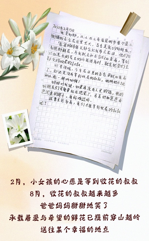 在今年情人节的前一天,她用稚嫩的笔记,写下了一篇令人心疼的日记:“好奇怪哦,今年花田里的百合早就比我高了,却还是没有等到收花的叔叔,明明她们还和以前一样灿烂啊?妈妈对我说,如果再没有人买的话,我的好朋友们可能要烂在地里了,看着她和爸爸面色沉重的样子,我好难过呀。还要长到多高,我们才能等到收花的叔叔呢?”