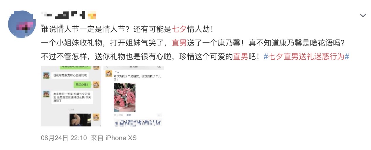 昨天,一个女生收到七夕的礼物,没想到居然是康乃馨!随即在朋友圈和微博进行吐槽,没想到带火了#七夕直男送礼迷惑行为#,网友们七嘴八舌,隔着屏幕都能感觉到女主心碎满地的声音。