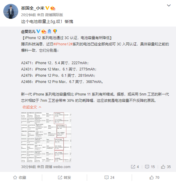 而正是因为iPhone12全系的电池容量被张国全吐槽,他表示这样的电池容量上5G网络,哎,惭愧!而这同时还也引起了网友们的热议,处于两极分化的态度。认同张国全的基本是米粉