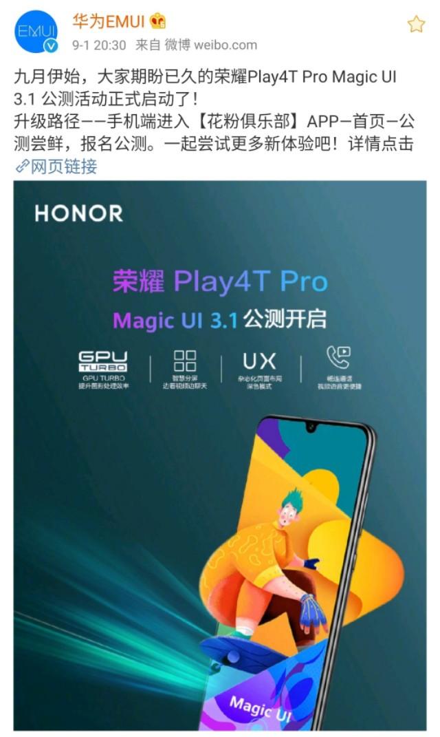 9月1日晚上20点30分,华为官微突发发文表示,又有一款华为机型,也就是华为旗下子品牌的荣耀Play4 TPro,正式开启最新版华为手机系统的公测。虽然,官方在行文时,写的是Magic UI 3.1,但懂手机的人都知道,就像realme UI是OPPO ColorOS的“套娃”系统一样,荣耀的Magic UI3.1,其实就是华为目前最新手机系统版本EMUI10.1了。