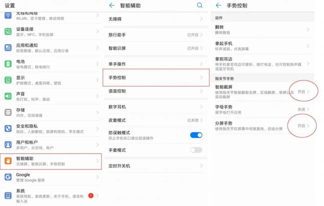 为了更好的体验,需要小伙伴们打开一些功能,首先打开【设置】,找到【智能辅助】,再找到【手势控制】,把【智能截屏】和【分屏手势】打开。