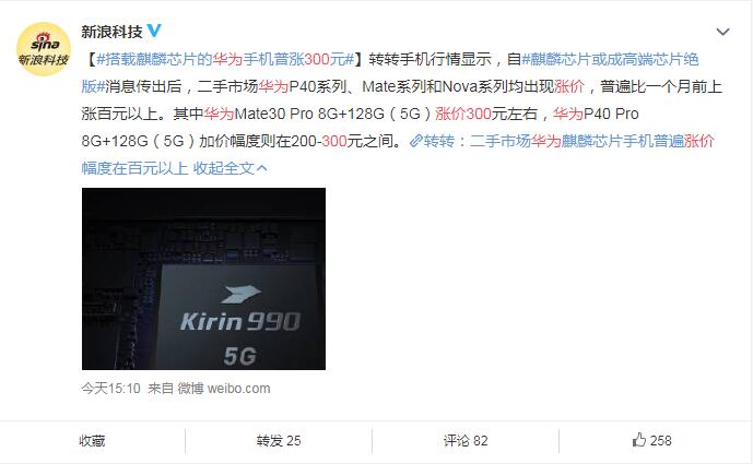有意思的是,受到麒麟9000处理器供应的影响,一些原来采用了麒麟高端芯片的旧款机型在线下市场开始涨价了。根据“新浪科技”的报道,在深圳华强北电子市场,华为mate30、P40、Nova7等机型,都出现了不同幅度的涨价,普遍涨价300元左右,热门机型甚至涨价500元。华为mate30保时捷设计版涨幅更是高达3000元,只要是采用麒麟990等处理器的机型基本上都涨价了,一些经销商甚至开始囤货。