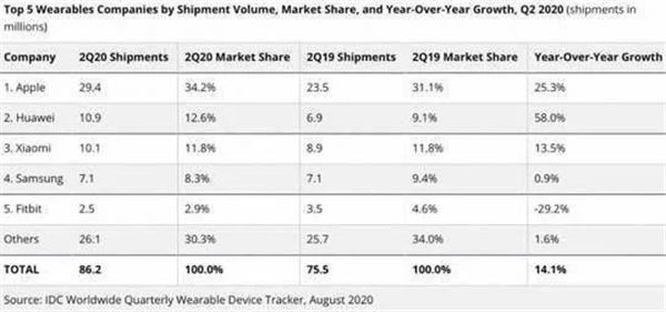 另外,值得一提的是,2020年第二季度,中国可穿戴设备厂商华为、小米则分别揽活了可穿戴设备市场出货量第二、三名的成绩。这里需要给大家强调的是,尽管在该季度华为可穿戴设备出货量不及苹果,也只是以微弱优势排在了小米的前面,但出货量1090万部以及同比大幅增长58.0%的成绩,这足以说明华为可穿戴设备蓬勃的发展势头。
