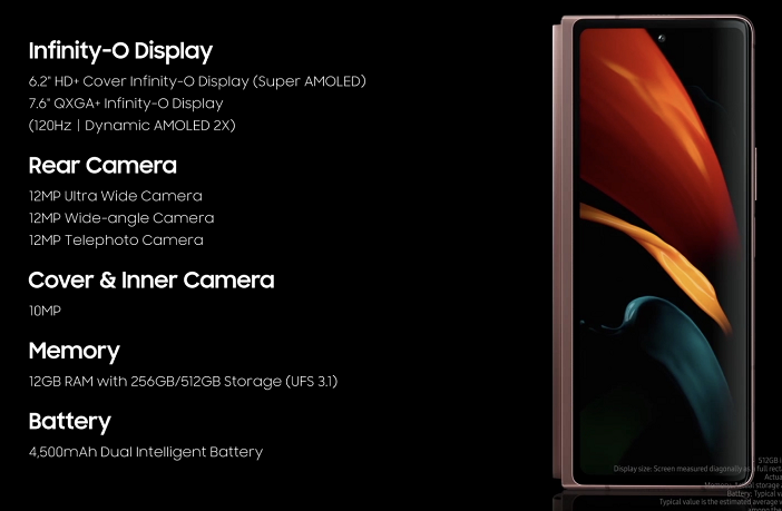 三星Galaxy Z Fold2的采用的是7.6英寸的内屏,2208×1768分辨率,支持20Hz刷新率;外屏尺寸为6.2英寸,2260×816分辨率。搭载骁龙865+处理器,内置12GB+256GB8512GB存储,前置1000万像素摄像头,后置1200万三摄,电池容量为4500毫安,支持25W快充,还有无线快速充电以及无线反向充电;杜比全景声喇叭,侧面电容式指纹识别等。