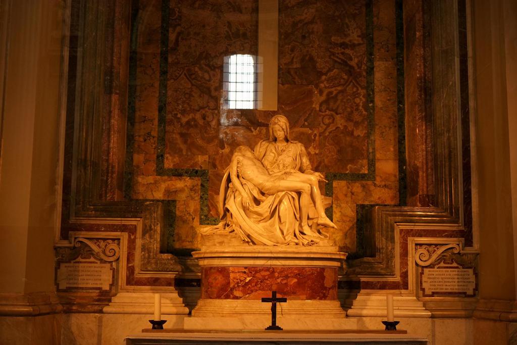 圣彼得大教堂的镇殿三宝除了上面的两件,在大殿右手边的小堂中,就是米开朗基罗的《圣殇》,被称为教堂中最优雅的作品。窄小的空间里大家都挤在玻璃窗的外围,白色的大理石雕像打着暖色的钨丝灯,别有一番感觉。这是米开朗基罗24岁时的创作,而且是米开朗基罗唯一一件签名作品。死去的基督身体廋弱、细长,横倚在圣母玛丽亚的两膝之间。圣母面容清秀、年轻、美丽、端庄,低着头静静的看着儿子,隐隐露出淡淡的忧伤。