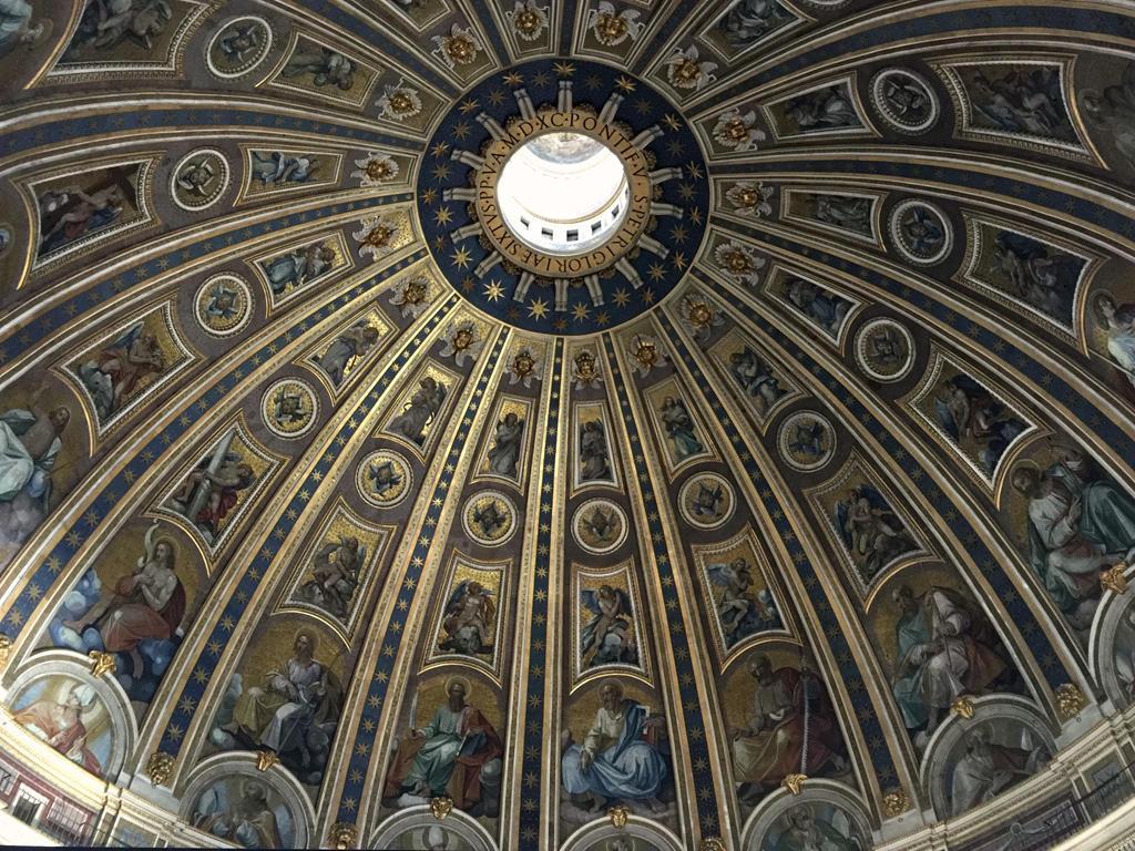 坐在圣彼得广场的台阶上吃完早点,不知道怎么就走到了教堂的侧面,然后就到了登顶的售票处。既然到这儿了,索性就先登顶再看教堂吧。事后证明这是一个明智的选择,因为出来的时候乘坐电梯的入口已经排了长队。票价分两档,爬楼梯5欧,坐电梯7欧。其实楼梯没有想象中的多,大概爬了十几分钟就到了一个平台(电梯也是到这里)。到顶尚远,需要继续向上爬,不知道转了多少圈,越向上越窄,最后通过一段异常狭窄陡峭仅能通一人的过道,这才脚踏实地。