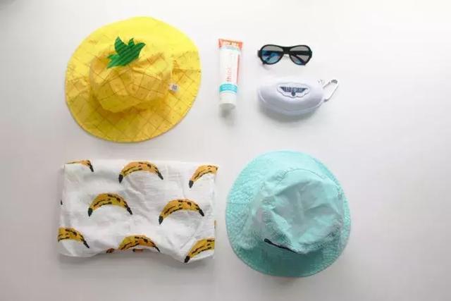 小朋友的防晒用品我也准备了挺充足的,带两顶帽子,图上的菠萝造型的帽子我很喜欢,用来拍照片很好看。然后还准备了防晒霜、墨镜和防晒衣。