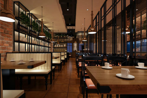 快餐厅的风格和餐桌椅等搭配有一定关系,所以在装修前期,就应对餐桌餐椅的风格定夺好。其中最容易冲突的是色彩、天花造型和墙面装饰品。
