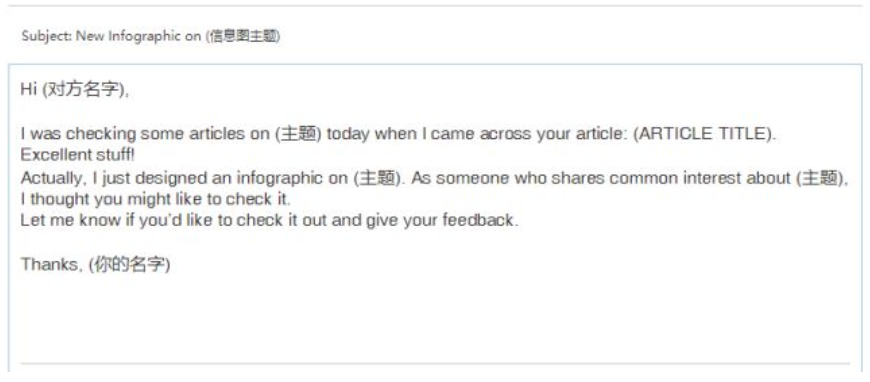 ? Step 5、然后将信息图去进行外部推广,比如提交到Reddit Infographics、Fast Company Infographics、Mashable Infographics等 。也可以发送邮件联系那些曾经链接过类似内容或分享过类似内容到社交媒体的人,如果他们喜欢你的内容,就会为你分享。邮件示例如下: