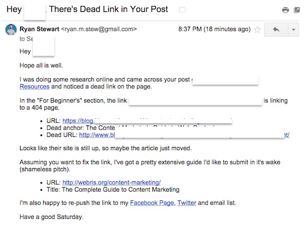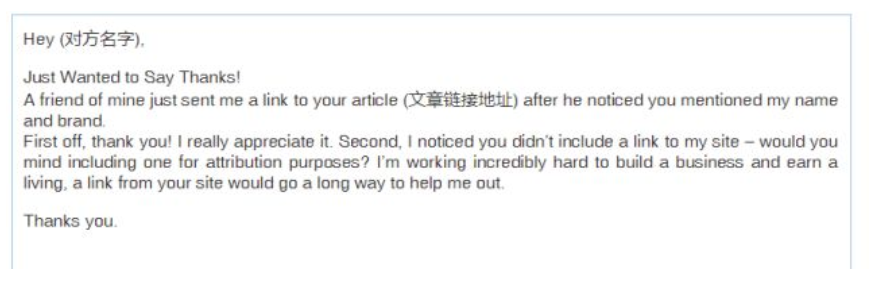 有人提到公司的品牌、网站名字,或者用了公司原创图片,可能只是提到了你的品牌,但是并没有给你做链接。一般来说,对内容认可才会采用,如果能找到他们,给你做链接的概率会很大。 可以用的品牌监听工具:? Google Altert利用Google Altert工具可以第一时间知道谁提到了公司的品牌或者网站,在Google Alter中输入想要监测的信息或者品牌名,它就会把相关信息自动发送到你的邮箱。? Mention.com这是一个社交媒体工具,它可以监控网络,包括主流的社交媒体渠道。每当有人提到你的名字、品牌或目标关键词时,你都能随时获得信息。它支持网页、桌面、iPhone和安卓端,而且用户界面友好,容易使用。发送邮件给文章作者,例如: