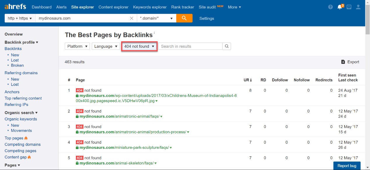 ? Step 1. 使用Ahrefs,在site explorer中输入目标网站域名,点击左侧导航栏Pages-Best by links,然后选择404 not found过滤选项查看404页面: