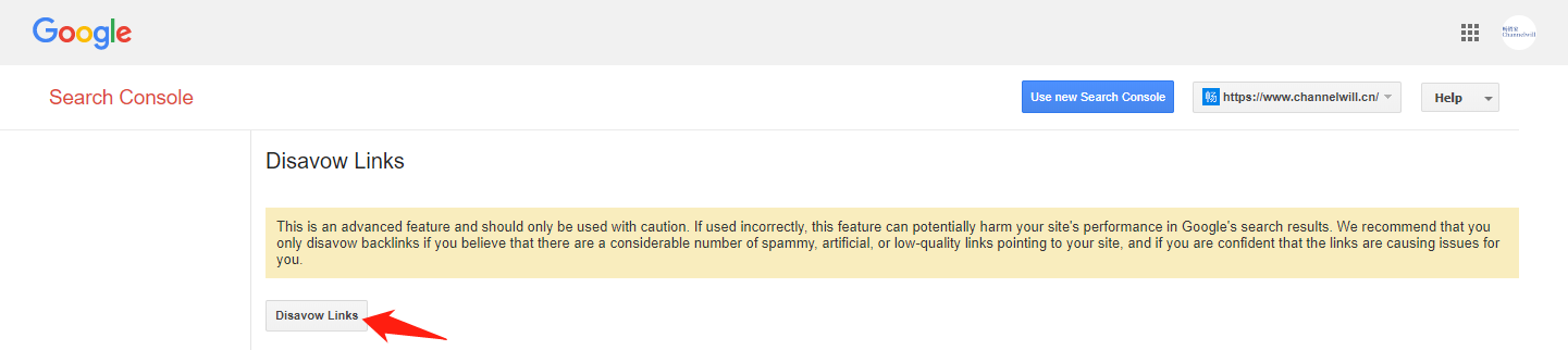 2. 假设您已注册并登录Google Search Console,打开 https://www.google.com/webmasters/tools/disavow-links-main disavow链接的网址。选择需要清除外链的网站,点击 “DISAVOW LINKS”(中文界面展示的语言会有所不同)
