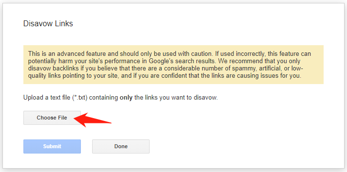 4. 点击 “Choose File”,选择第一步创建的垃圾外链TXT文件,然后点击 “Submit”(中文界面展示的语言会有所不同)