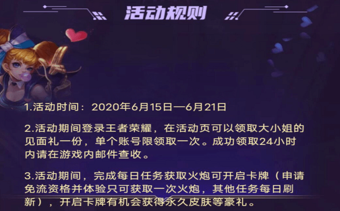那在15号王者荣耀也是开启了一个免费的福利活动,这个活动是实打实的免费的,其中有着5款史诗皮肤可以任选其一,活动名字叫大小姐的甜心暴击,活动的参与方式很简单,每日完成指定任务就可以获得火炮,而火炮可以开启卡牌,开启卡牌就有几率获得永久皮肤了,那在这五款永久皮肤中,孙尚香水果甜心价值888点券。