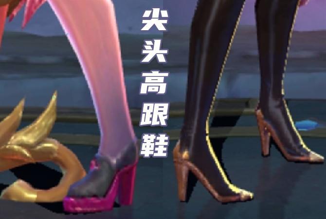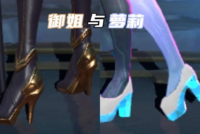 这两双鞋子真的很简单呢,不管你是帅哥还是妹子,只要你玩过中路就一定知道这两双鞋的主人是谁了。左边这位英雄是很御姐的,这款鞋子的颜色主题就是黑色和金色,黑金色搭配起来是很有神秘的感觉呢。右边这位是个小妹妹哦,你应该也猜得出来吧,这款还是一个CP皮肤呢,五光十色的皮肤,很有未来感,还有她的鞋跟,闪耀着蓝色的鎏光。