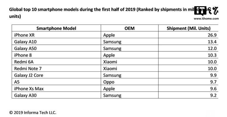 IHS Market统计机构发布最新报告,在2019年上半年苹果iPhone XR成为最畅销的智能手机,其出货量达到了第二名三星Galaxy A10的两倍。