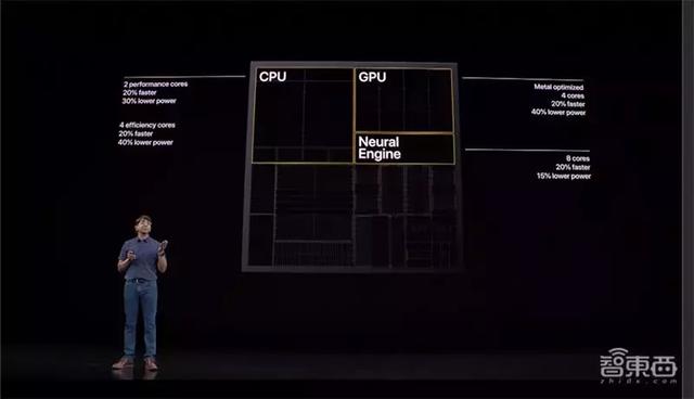 相比上一代A12,CPU、GPU和神经引擎(Neural Engine)均对速度和能耗进一步优化。
