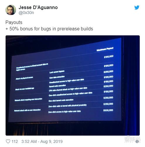 智东西8月9日消息,苹果在2019年黑帽技术大会上宣布扩展其“漏洞赏金计划”,最高赏金达到100万美元。苹果宣布该计划适用于macOS、watchOS和tvOS。