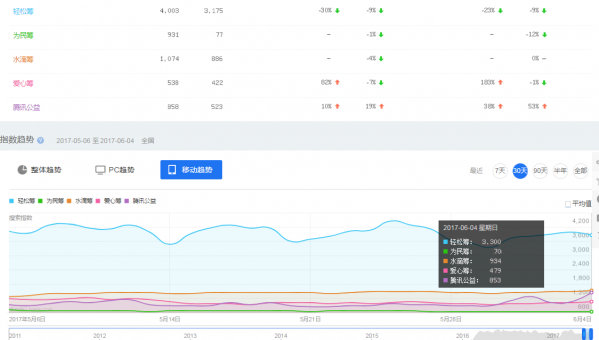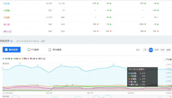 据悉,市场上主流的筹款平台主要有五家,分别是:轻松筹、为民筹、水滴筹、爱心筹、腾讯公益。那么这些平台,到底谁才是用户心中的第一选择?我们通过百度的一个小工具——百度指数来看一下: