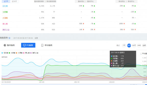 通过看图,我们发现一个非常奇怪的现象是为民筹的百度指数在PC趋势下,有个明显的分界点:5月14日前基本上没什么变化,处于五家的最后一名,而5月14日当天突然飙升6倍,停留在1000附近,此后一直维持在一条直线附近。甚至在6月4日当天,还超过了轻松筹,位列第一。