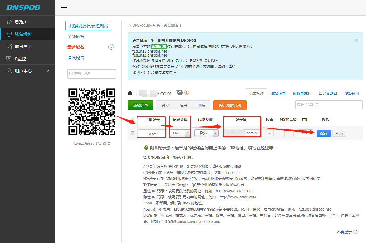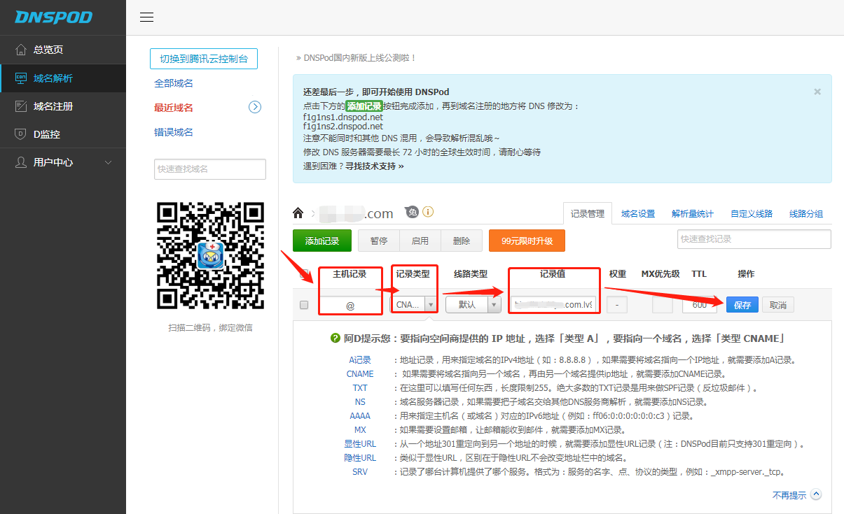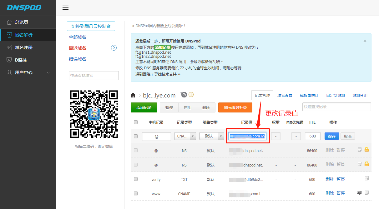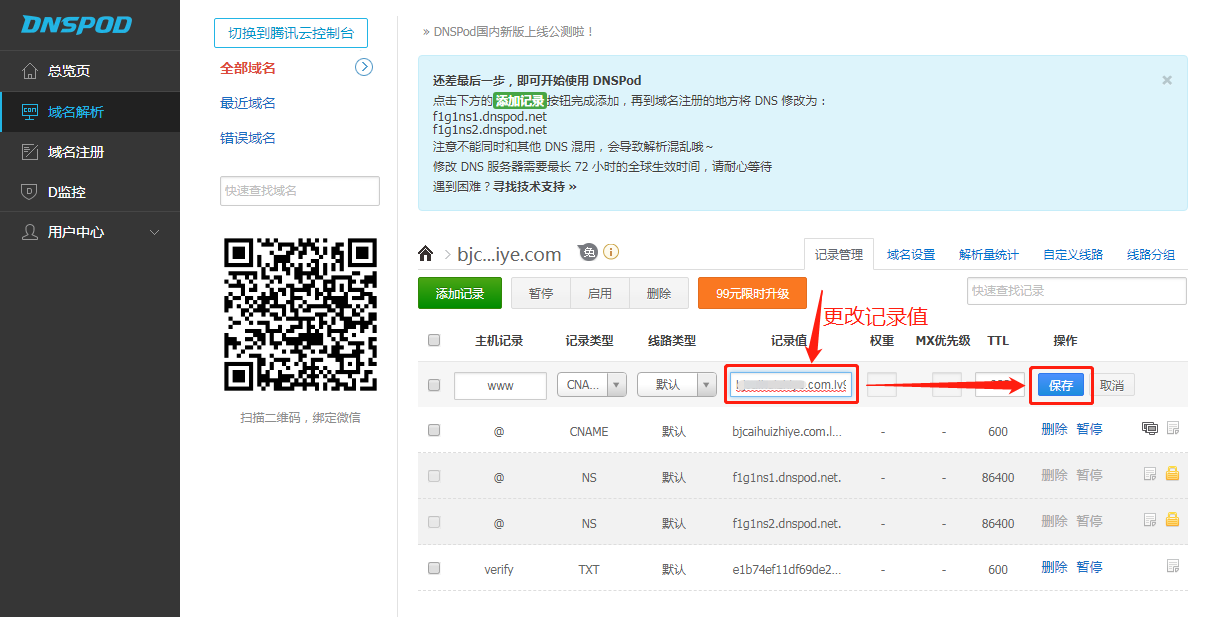 更改已给到的记录值并点击保存,即完成了域名解析设置。