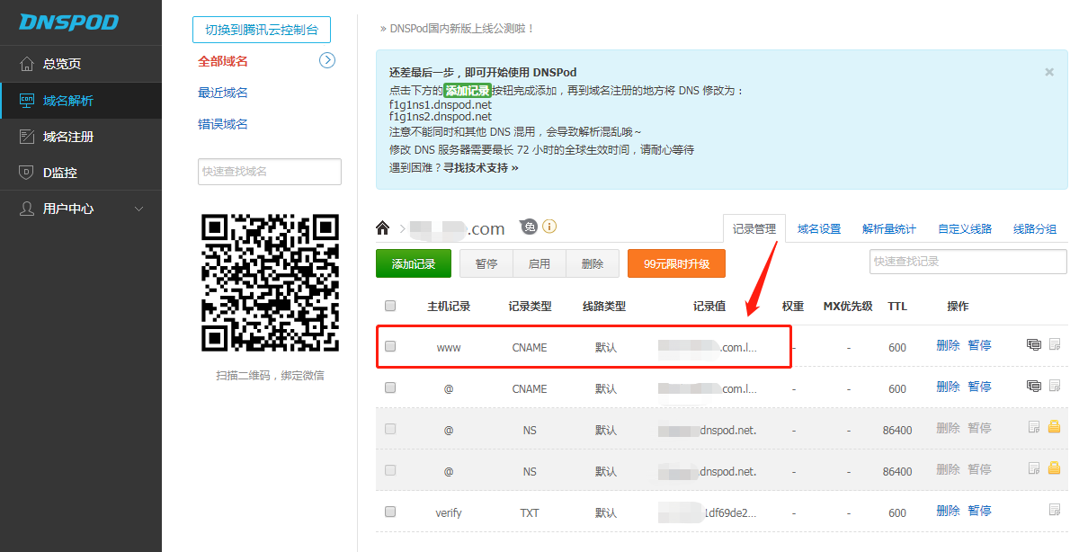 设置域名解析记录,需要登录到具有该域名管理权的解析平台,本文以DNSPod解析平台为例。
