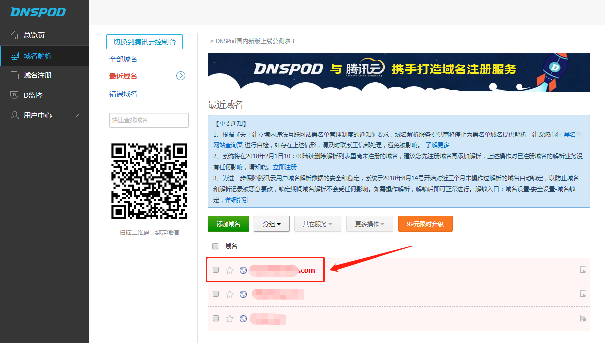 登录DNSPod解析平台后,点击“域名解析”并且点击需设置解析记录的域名。