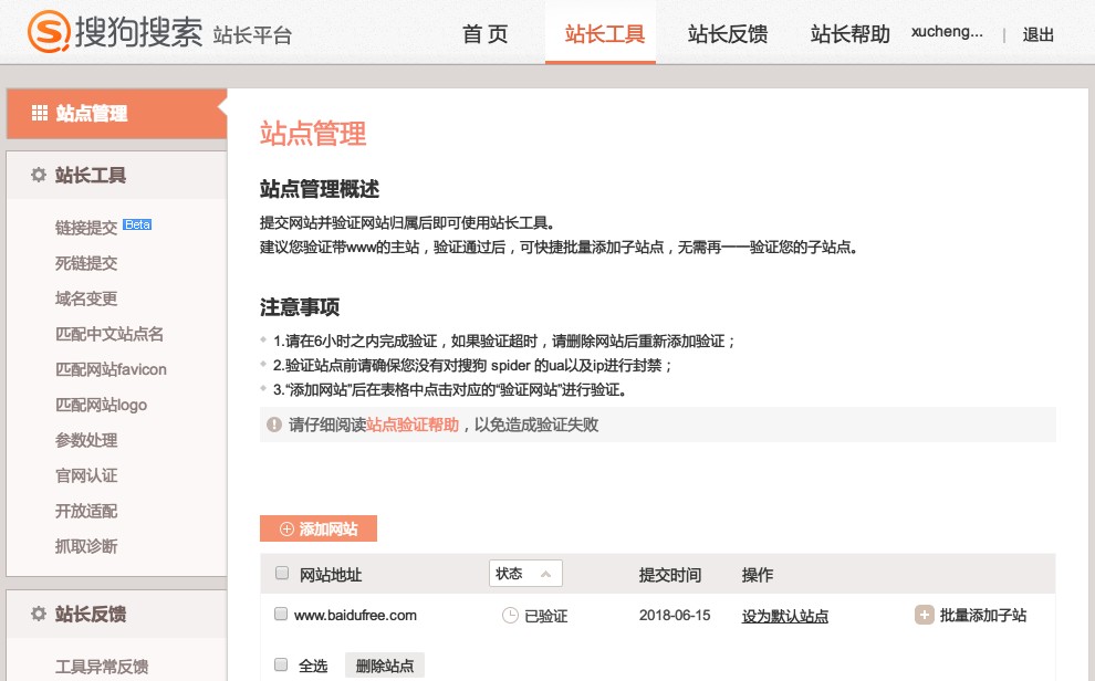 在搜狗站长平台后台,点击站点管理——添加网站。接下来按提示操作就可完成网站归属认证,网站归属认证后才能提交站点LOGO。