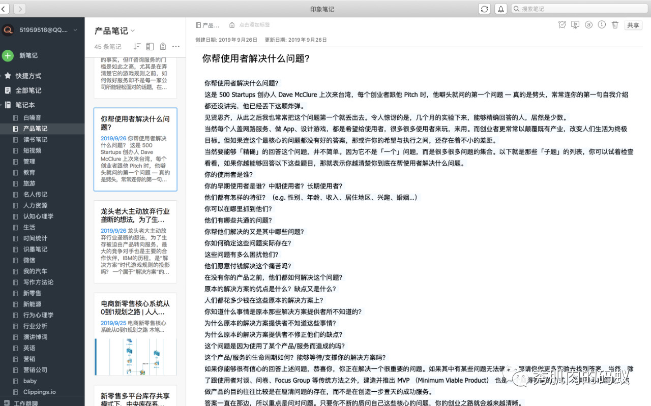 印象笔记最强大的就是收藏功能,通过浏览器扩展、移动端扩展,不管你是在工作中在36氪、钛媒体、知乎、人人都是产品经理上看到的任何一篇好文章、还是在床头的微信公众号文章都可以轻松收藏。