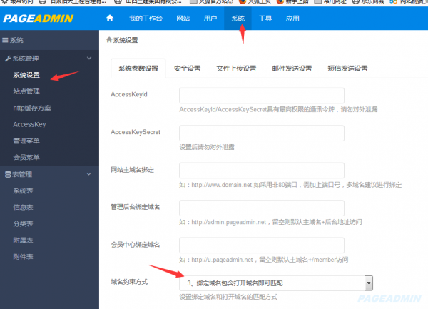 2、进入系统>系统设置,修改域名约束方式,如下图