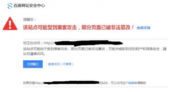 百度网址安全中心提醒您:该站点可能受到黑客攻击,部分页面已被非法篡改!下图所示: