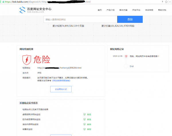 临近2019年底,客户的公司网站被百度网址安全中心拦截了,公司网站彻底打不开了,影响范围很大,于是通过朋友介绍找到我们SINE安全公司寻求帮忙解封,关于如何解除百度的安全拦截提示,下面就将我们SINE安全的解决办法分享给大家,希望能对您有所帮助。