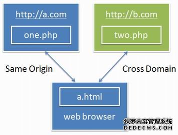 SOP就是Same Origin Policy同源策略,指一个域的文档或脚本,不能获取或修改另一个域的文档的属性。也就是Ajax不能跨域访问,我们之前的Web资源访问的根本策略都 是建立在SOP上的。它导致很多web开发者很痛苦,后来搞出很多跨域方案,比如JSONP和flash socket。如下图所示: