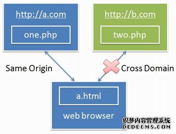 后来出现了CORS-CrossOrigin Resources Sharing,也即跨源资源共享,它定义了一种浏览器和服务器交互的方式来确定是否允许跨域请求。它是一个妥协,有更大的灵活性,但比起简单地允许所有 这些的要求来说更加安全。简言之,CORS就是为了让AJAX可以实现可控的跨域访问而生的。具体可以参见我的这篇文章《HTML5安全:CORS(跨域 资源共享)简介》。示意如下图所示: